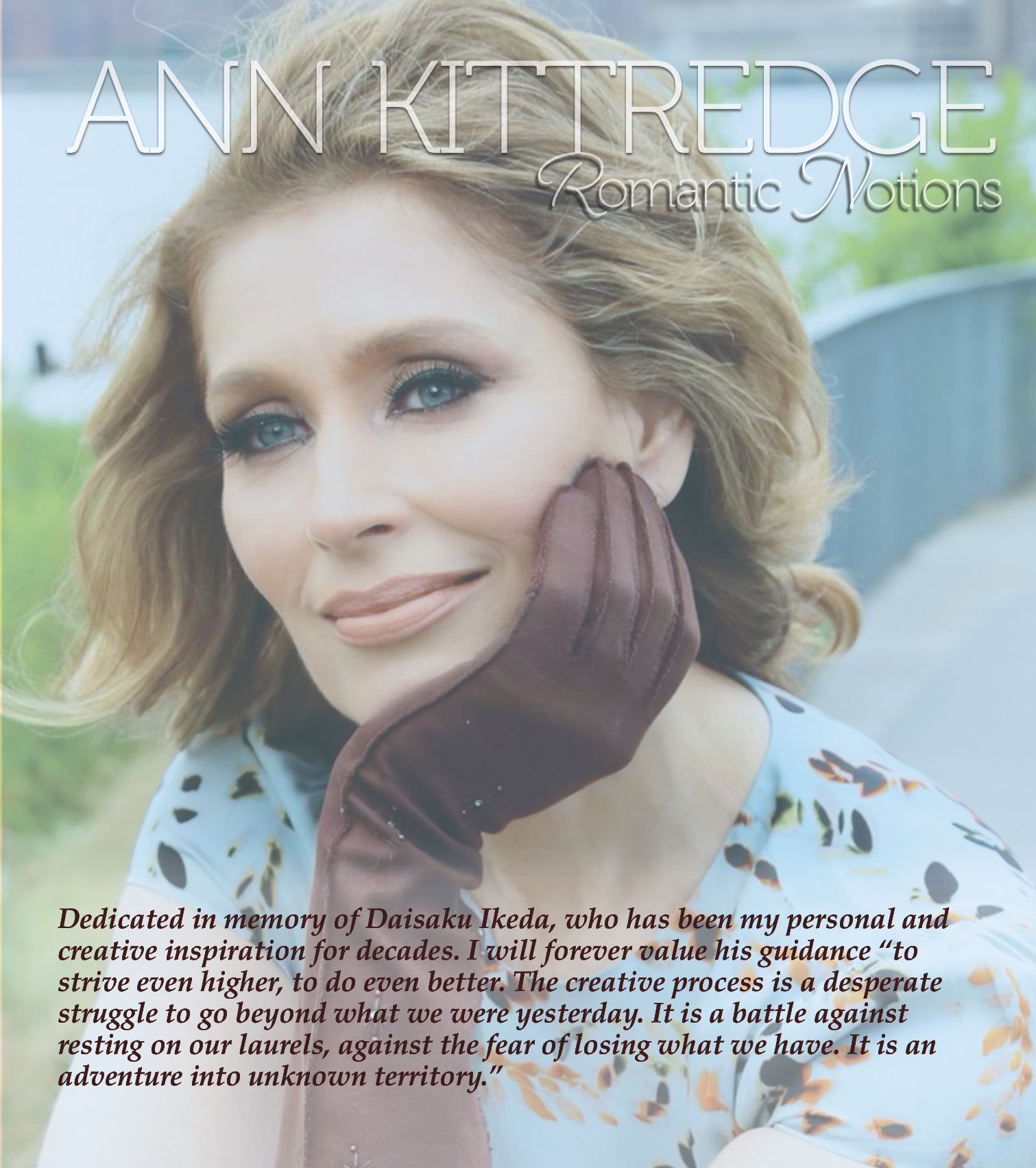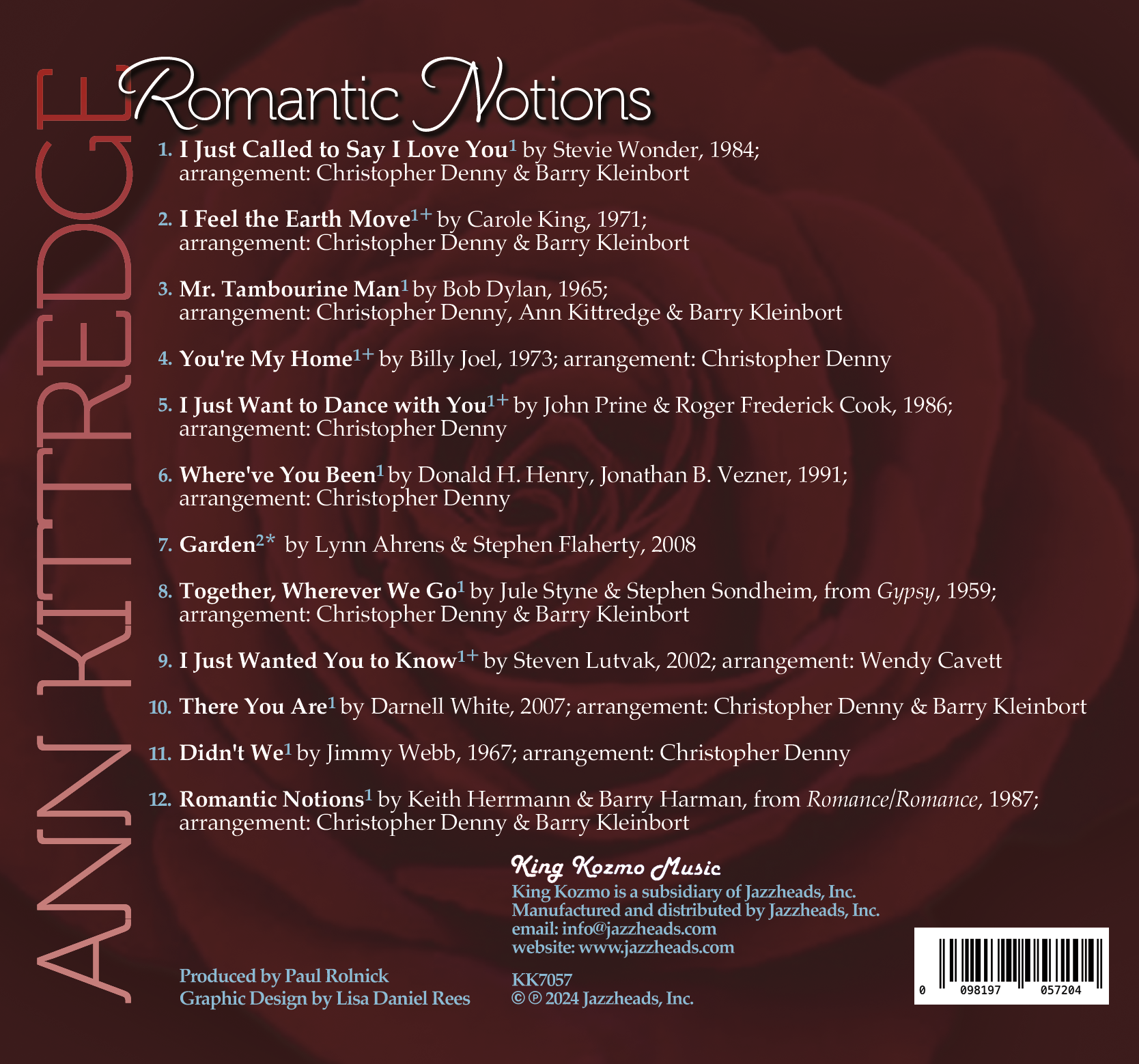 If you own Ann Kittredge’s previous CD outing, the award winning reIMAGINE, then you are already aware of Ms. Kittredge’s penchant for musical repertoire that not only traverses genres but, in one instance, even centuries. Ann had wanted her new album, Romantic Notions, to be even more diverse and ambitious, featuring a wider display of rhythms and sentiments. And, as a vital member of the Ann Kittredge creative team (along with musical director Christopher Denny and producer Paul Rolnick). I believe we have accomplished just that. Although you’ll find a few of the requisite love songs, the title is meant to be far more catholic and all encompassing. Besides the basic tropes of love, Ann gives musical voice to the seesawing emotional underpinnings that fuel, and sometimes dismantle, relationships: If you take the time to look (and listen), you’ll discover various facets of ”the courtship dance”: The flirtation, the elation, the separation, the devastation, and…for those of you who don’t care a jot about any of the aforementioned…the titillation. If you doubt my last remark, then immediately give a listen to “I Feel the Earth Move,” a Carole King warhorse from the 70s that has been outfitted with a new thermostat to control its heightened level of heat.